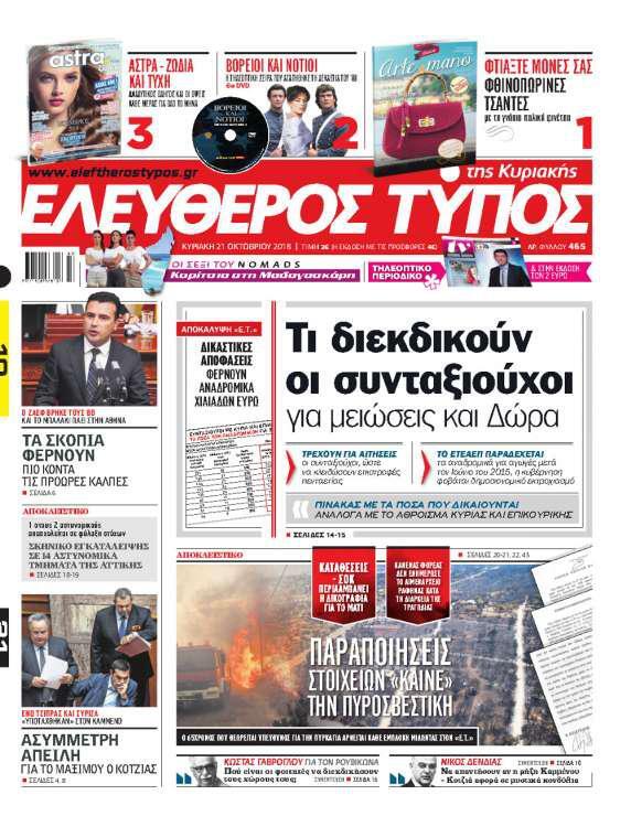 Με κεντρικό τίτλο «Τι διεκδικούν οι συνταξιούχοι για μειώσεις και δώρα» καθώς όπως αποκαλύπτει ο Ελεύθερος Τύπος της Κυριακής, οι δικαστικές αποφάσεις που έχουν βγει έως τώρα «διατάσσουν» στα Ταμεία την επιστροφή κομμένων συντάξεων και Δώρων, λόγω αντισυνταγματικότητας, δύσκολα ανατρέπονται και ανοίγουν το δρόμο για μαζικές διεκδικήσεις από δεκάδες χιλιάδες συνταξιούχους!