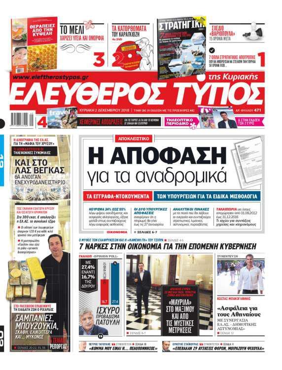 Στην πολιτική σκηνή θα διαβάστε αναλυτικό ρεπορτάζ που έχει ο Ελεύθερος Τύπος της Κυριακής και αναλύει τον μύθο των ελαφρύνσεων και την «καμένη γη» του Αλέξη Τσίπρα αλλά για τις εφτά νάρκες στην οικονομία που αφήνει στην επόμενη κυβέρνηση η συγκυβέρνηση ΣΥΡΙΖΑ-ΑΝΕΛ.