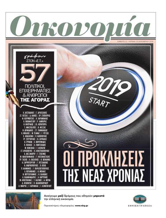 2019 Οι προκλήσεις του νέου έτους: Γράφουν οι Οι Κ. Χατζηδάκης, Γ. Δραγασάκης, Στ. Πέτσας, Δ. Λιάκος, Χρ. Σταϊκούρας, Φ. Κουρμούσης, Κ. Καραμανλής, Κ. Παπανάτσιου, Ρ. Λαμπίρης, Θ. Μητράκος, Ελ. Κουντουρά, Τ. Αναστασάτος, Θ. Φέσσας, Ν. Δρανδάκης, Στ. Γιαννακίδης, Κ. Μίχαλος, Μ. Τσαμάζ, Γ. Ρέτσος, Χ. Απαλαγάκη, Π. Καπόπουλος, Γρ. Στεργιούλης, Ν. Ζαρκαλής, Θ. Τρύφων, Χ. Μπρουμίδης, Κ. Κόλλιας, Α. Παντελιάδης, Μ. Κόνσολας, Γ. Αλεβίζος, Στ. Αραχωβίτης, Β. Αποστολόπουλος, Α. Αλεξάνδρου, Γ. Στασινός, Μ. Καλογιαννάκης, Τ. Κοτζαναστάσης, Γρ. Τάσιος, Α. Βασιλικός, Θ. Βενιάμης, Α. Σαρρηγεωργίου, Γ. Πετσαλάκης, Β. Ανδρικόπουλος, D. Beko, Π. Αλαμάνος, Γ. Παρασκευόπουλος, Λ. Ποταμιάνος, Θ. Μπάκας, Ν. Κουτσογιάννης, Θ. Χαλκίδης, Α. Χαλαμανδάρης, Α. Καρυτινός, Μ. Αποστολίνας, Τ. Καζίνος, Α. Νούκα, Δ. Αυλωνίτης, Π. Καλαποθαράκου, Α. Μακρής, Γ. Καρανίκας, Γ. Ασμάτογλου