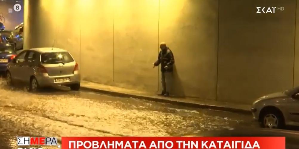 Οι έντονες βροχοπτώσεις και οι καταιγίδες σε διάφορα σημεία της Αττικής το ξημέρωμα της Παρασκευής, προκάλεσαν ζημιές. Σε κάποια σημεία είχαν χαλάσει τα φρεάτια και είχε βγει πολύ νερό. Ο δημοσιογράφος στεκόταν μπροστά σε μια μικρή λίμνη. Για να μπορέσει να βγάλει το ρεπορτάζ χωρίς να φάει μπουγέλωμα, έπρεπε να διακόπτει τη ροή του λόγου για να ενημερώσει τα διερχόμενα οχήματα να κατεβάσουν ταχύτητα.