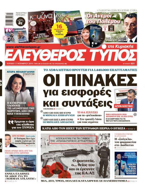 Κεντρικό θέμα στην εφημερίδα μας είναι το αποκλειστικό δημοσίευμα για τις αλλαγές στο ασφαλιστικό που ετοιμάζει ο υπουργός Εργασίας Γιάννης Βρούτσης. Στον Ελεύθερο Τύπο της Κυριακής θα βρείτε τους πίνακες για τις εισφορές και τις συντάξεις, καθώς και πληροφορίες για όσα πρόκειται να αλλάξουν στα μπλοκάκια και στους αγρότες. Το νέο ασφαλιστικό συνολικά επηρεάζει περισσότερους από 1.400.000 επαγγελματίες.