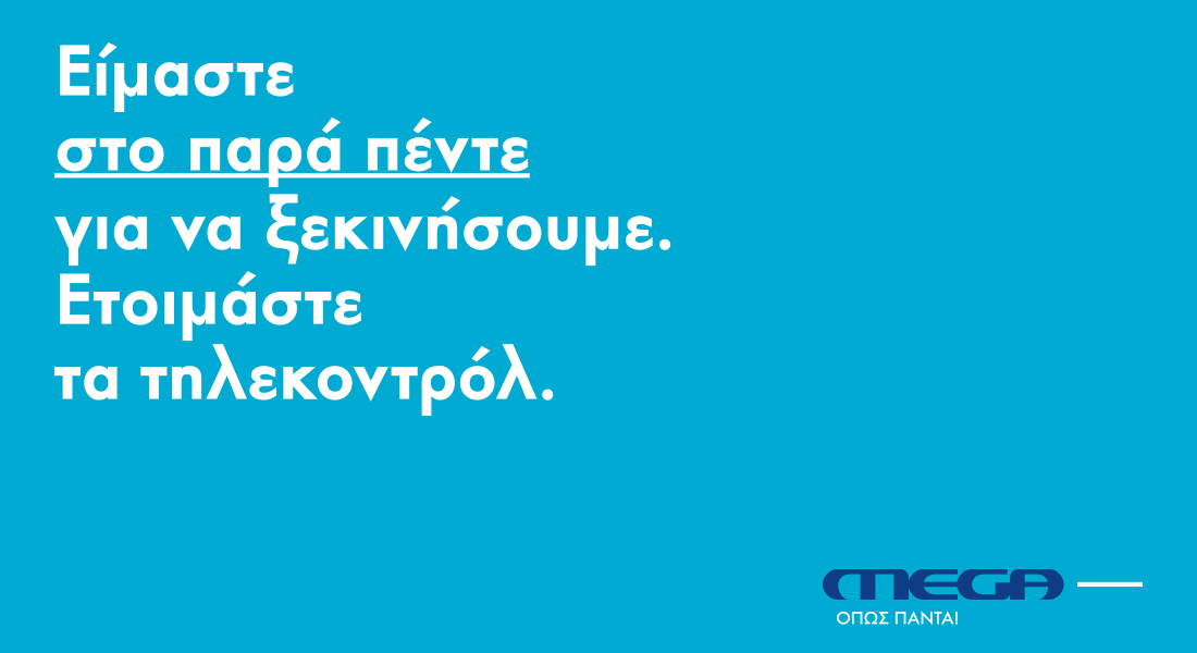 Ήδη, μάλιστα, έχει γίνει γνωστό το σλόγκαν της νέας διαφημιστικής καμπάνιας, το οποίο αναφέρει: «Είμαστε στο παρά πέντε για να ξεκινήσουμε. Ετοιμάστε τα τηλεκοντρόλ». Το δε νέο logo του καναλιού θα συνοδεύεται από τη φράση «MEGA Όπως πάντα!».