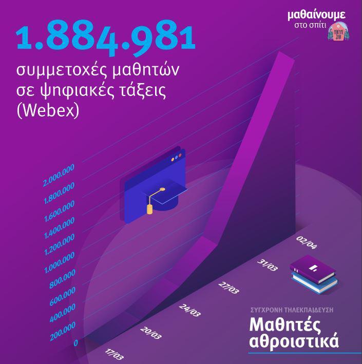 – 1.884.981 συμμετοχές μαθητών αθροιστικά σε ψηφιακές τάξεις (Webex),