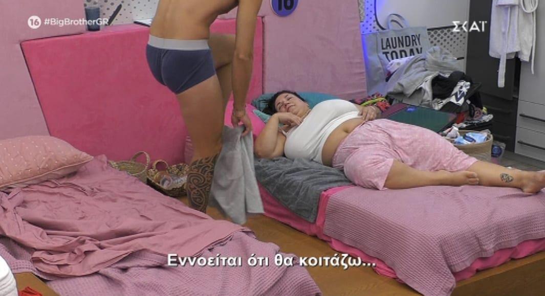 Η παίκτρια είχε καρφώσει τα μάτια της στο εσώρουχο του Δημήτρη, με τον ίδιο να της ζητά να μην τον κοιτάζει. Εκείνη, όμως, απαντά: «Εννοείται ότι θα κοιτάζω»! Η Αφροδίτη Γεροκωνσταντή, όμως, δεν αρκείται απλά στο οφθαλμόλουτρο και τον αγγίζει στα γεννητικά όργανα.