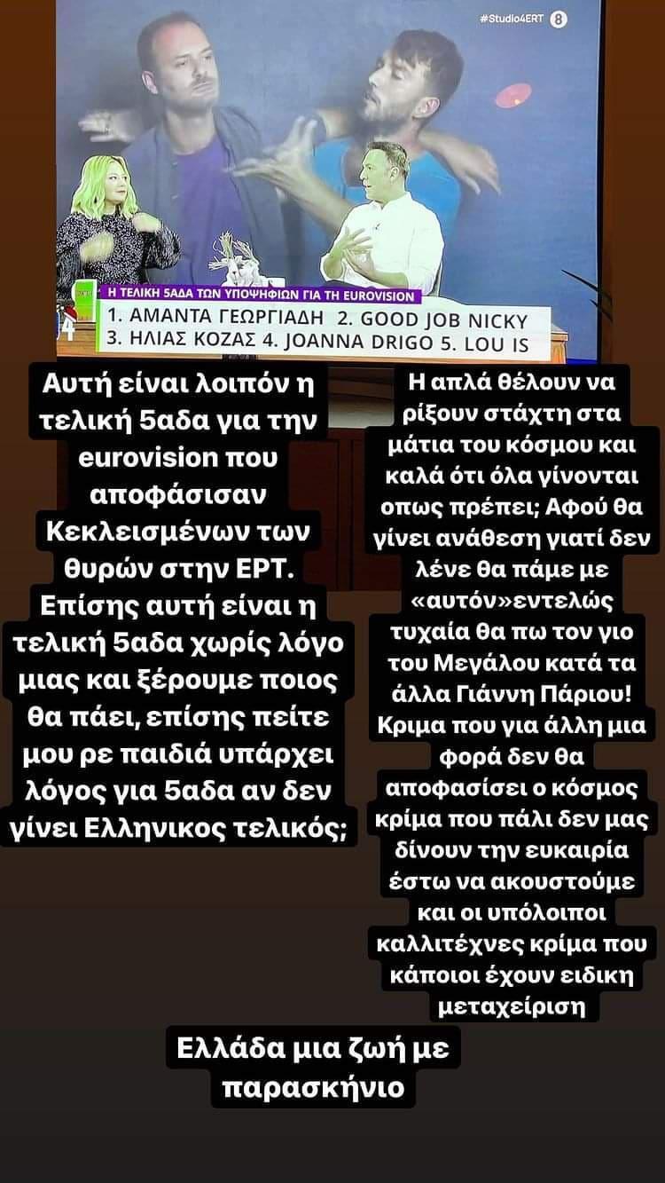 «Αυτή είναι, λοιπόν, η τελική πεντάδα για την Eurovision, που αποφάσισαν κεκλεισμένων των θυρών στην ΕΡΤ. Επίσης, αυτή είναι η τελική πεντάδα χωρίς λόγο, μιας και ξέρουμε ποιος θα πάει. Επίσης, πείτε μου ρε παιδιά υπάρχει λόγος για πεντάδα, αν δεν γίνει ελληνικός τελικός; Ή απλά θέλουν να ρίξουν στάχτη στα μάτια του κόσμου και καλά ότι όλα γίνονται όπως πρέπει; Αφού γίνει ανάθεση, γιατί δεν λένε ότι θα πάμε με “αυτόν”, εντελώς τυχαία θα πω τον γιο του Μεγάλου κατά τα άλλα Γιάννη Πάριου!