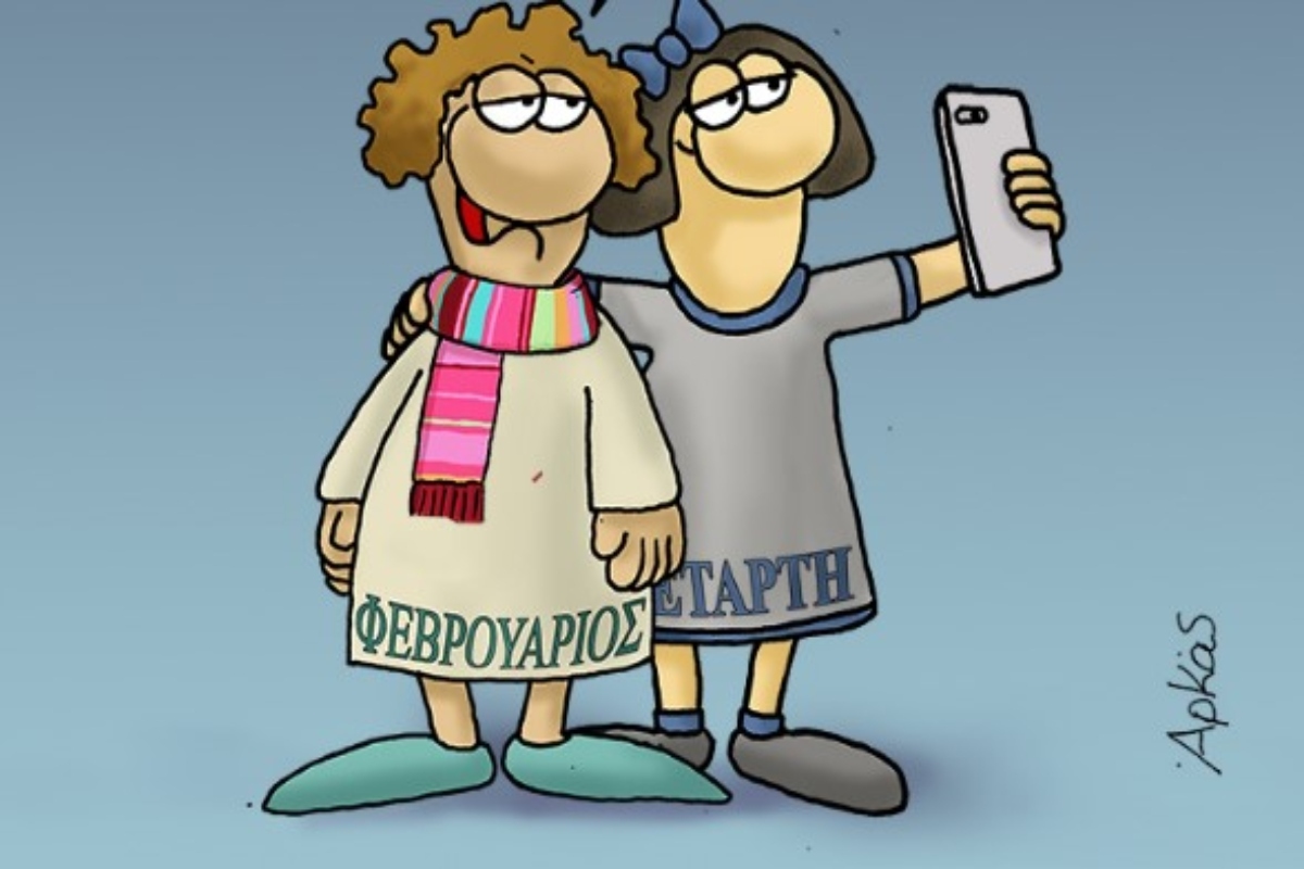 Η Τετάρτη παίρνει αγκαλιά τον Φεβρουάριο και ποζάρουν με χαμόγελο. «Αν δεν βγω καλός θα τη σβήσεις» αναγράφεται στο σκίτσο.