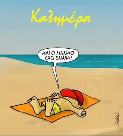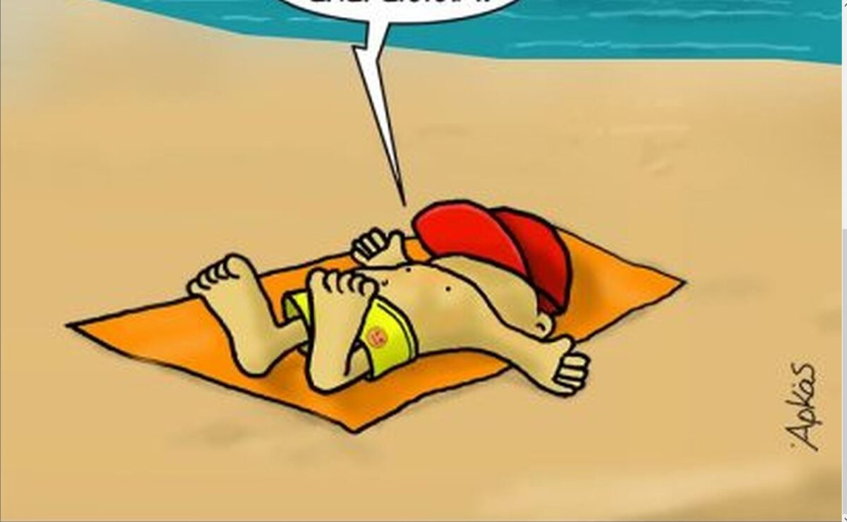 Με ένα σκίτσο που μυρίζει θάλασσα και φιλοξενεί τα χρώματά της αλλά και τα καυτά καλοκαιρινά χρώματα της άμμου, ο Θανασάκης, ανάσκελα στην πετσέτα του, δίπλα στη θάλασσα και κάτω από τον ήλιο, αναφωνεί, με το ιδιαίτερο φωνητικό του ιδίωμα, μια γνωστή σε όλους μας φράση: