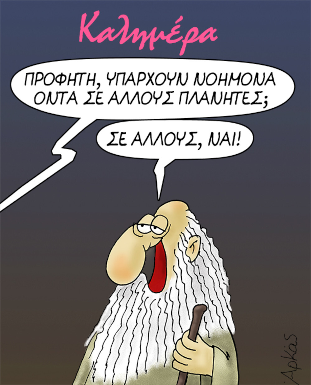 Ο αγαπημένος σκιτσογράφος Αρκάς εύχεται καλημέρα σήμερα, Τρίτη 6 Σεπτεμβρίου, με τον κυνικό Προφήτη να επανέρχεται δριμύτερος, σχολιάζοντας τη ζωή στη Γη, αλλά και σε άλλους πλανήτες.