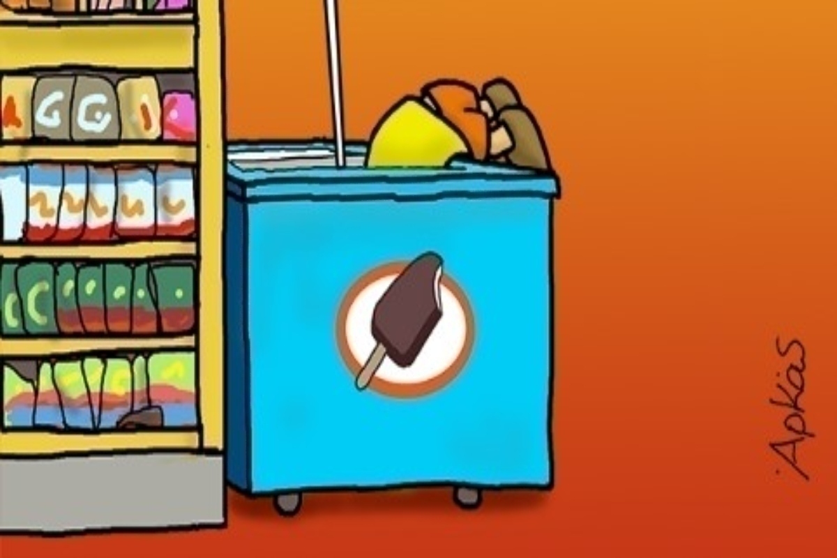 Στο σημερινό σκίτσο ο Αρκάς, τον δείχνει να έχει μπει ολόκληρος μέσα στο ψυγείο με τα παγωτά για να δροσιστεί. Αυτή τουλάχιστον είναι η απάντηση που δίνει στον ιδιοκτήτη του περιπτέρου όταν τον ρωτά τι κάνει εκεί.