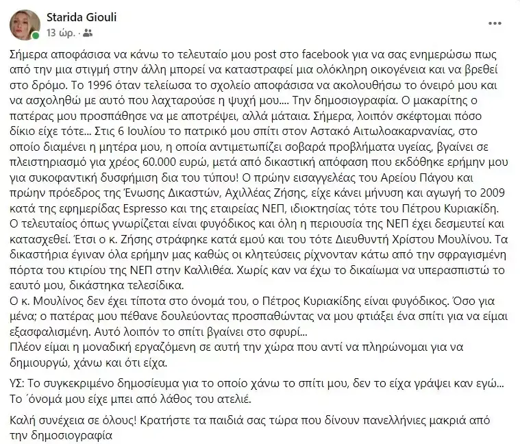 Συγκεκριμένα, η δημοσιογράφος της εφημερίδας Espresso, Γιούλη Σταρίδα, με ένα post στο Facebook έκανε γνωστό πως πλέον χάνει το πατρικό της σπίτι στην Αιτωλοακαρνανία, που ζει η γιαγιά και η μητέρα της, για χρέος 60.000 που της επιδικάστηκε για συκοφαντική δυσφήμιση.
