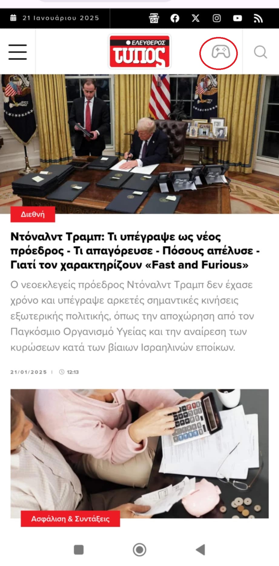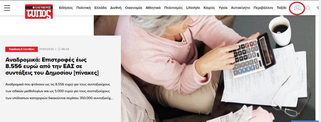Όταν θα μπαίνεις στο Eleftherostypos.gr πάνω δεξιά (εκεί που είναι ο κόκκινος κύκλος στις φωτογραφίες παρακάτω) θα δεις την εικόνα ενός τηλεχειριστηρίου κονσόλας και πατώντας πάνω της θα μπορείς να διαλέξεις από μια μεγάλη γκάμα παιχνιδιών που είναι εντελώς δωρεάν.