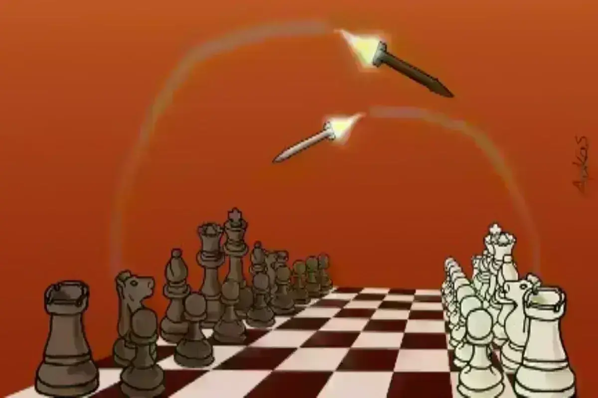 Ο βετεράνος σκιτσογράφος παρομοιάζει τις κινήσεις των κρατών με παρτίδα σκάκι. Εκεί πάνω στη σκακιέρα, οι δύο πλευρές δεν έχουν κινήσει ακόμη κάποιο πιόνι τους, αντίθετα ανταλλάσσουν πυραύλους.