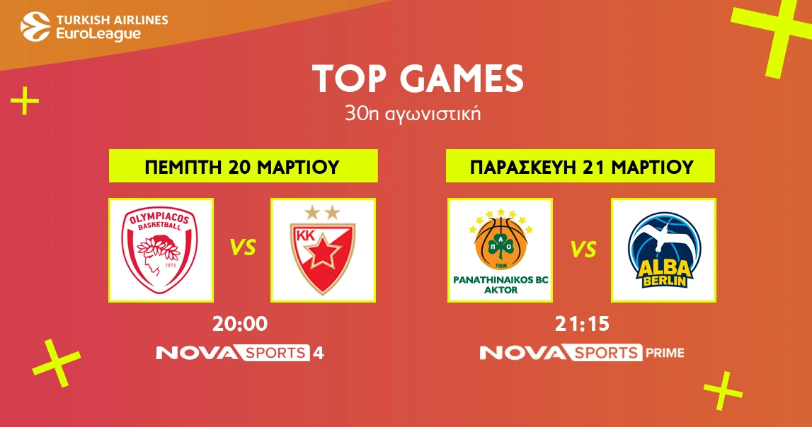 - 21:15 Euroleague: Παναθηναϊκός AKTOR – Άλμπα Βερολίνου Novasports Prime σε περιγραφή του Χρήστου Καούρη, σχόλιο της Δώρας Παντέλη και ρεπορτάζ του Ορέστη Συντελή