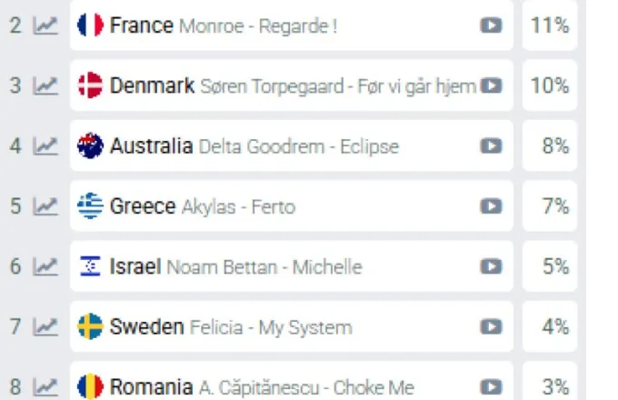 Ο Ακύλας, που θα εκπροσωπήσει τη χώρα μας με το «Ferto», είχε φτάσει, πριν λίγο διάστημα, στην τρίτη θέση, ωστόσο στην πορεία έπεσε στην τέταρτη και πλέον βρίσκεται στην πέμπτη, συγκεντρώνοντας ποσοστό νίκης 7%.