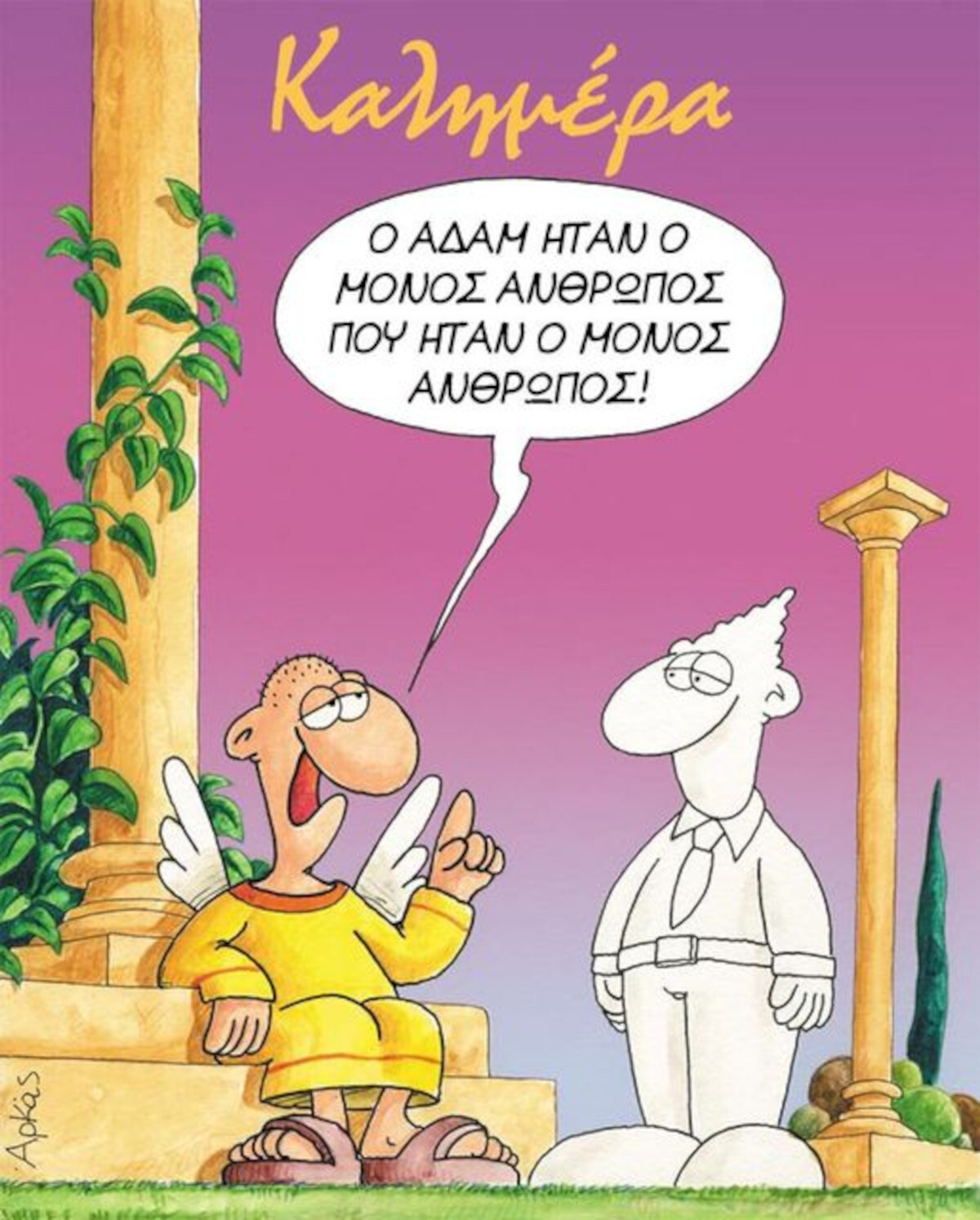 Ο αγαπημένος σκιτσογράφος Αρκάς εύχεται καλημέρα σήμερα στους απανταχού θαυμαστές του, με έναν άγγελο να μοιράζει... σοφία. Άραγε, τι παραπάνω ή τι λιγότερο ήξερε ο Αδάμ;