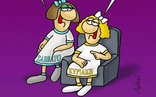 Όπως μπορείτε να δείτε στο σκίτσο που έχει αναρτήσει, το Σάββατο έχει βαφτεί και ετοιμάζεται να βγει… Μέχρι τις 24:00 όμως καθώς η Κυριακή περιμένει γιατί θέλει να βγει και εκείνη.