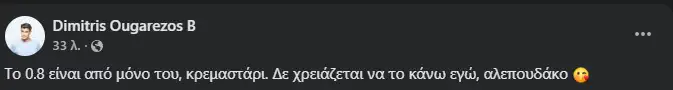 O Δημήτρης Ουγγαρέζος, ο οποίος δε μασάει τα λόγια του, δεν θα μπορούσε να αφήσει ασχολίαστη την ανάρτηση αυτή. Μέσα από τον λογαριασμό του στο facebook έγραψε: «Το 0.8 είναι από μόνο του, κρεμαστάρι. Δε χρειάζεται να το κάνω εγώ, αλεπουδάκο».