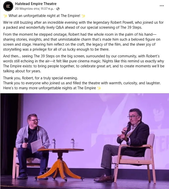 Με αφορμή ειδική προβολή της ταινίας «The 39 Steps», στην οποία είχε πρωταγωνιστήσει το 1978, υποδυόμενος τον μυστικό πράκτορα Richard Hannay, ο Ρόμπερτ Πάουελ βρέθηκε καλεσμένος στο Empire Theatre και δείτε τον παρακάτω στη σπάνια δημόσια εμφάνιση που έκανε.