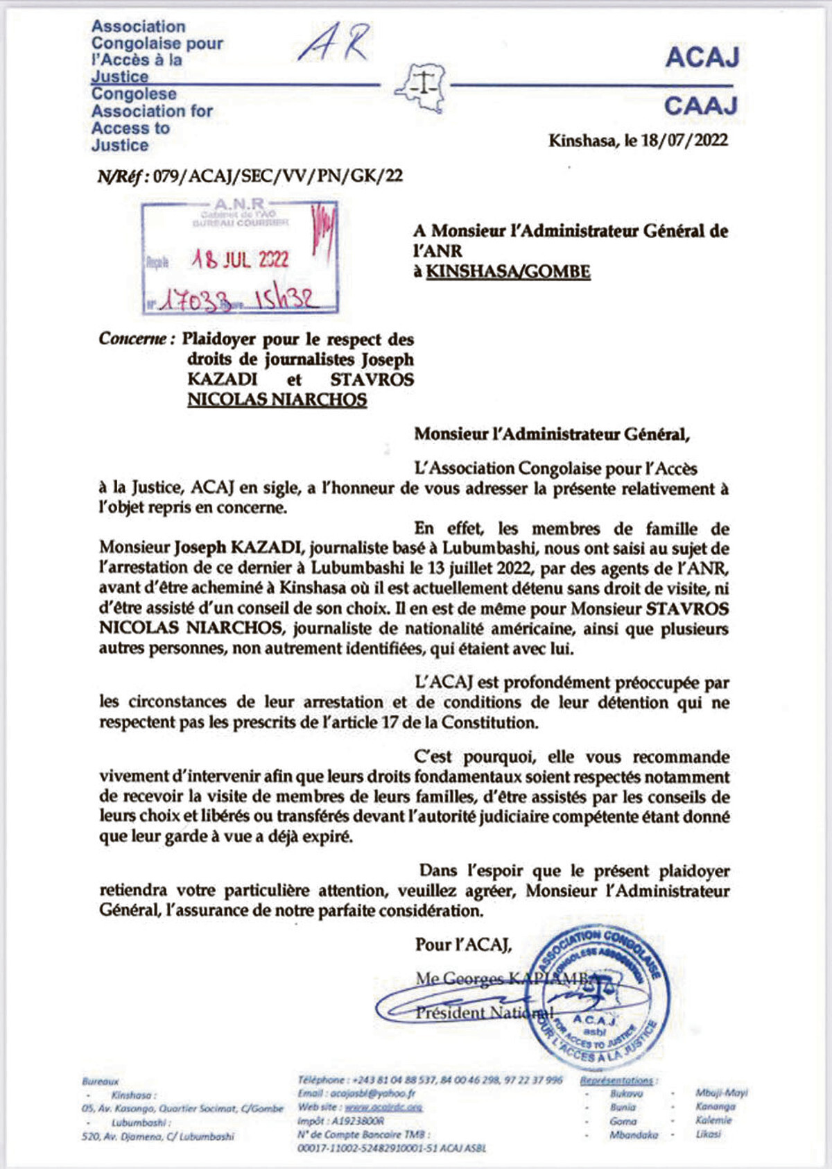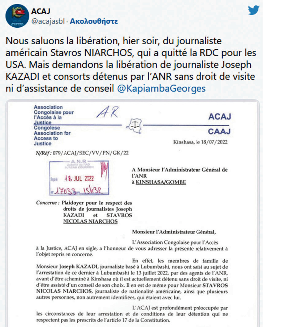 Λίγες ώρες έπειτα από αυτές τις αναρτήσεις ο Σταύρος-Νικόλαος Νιάρχος συνελήφθη από τις μυστικές υπηρεσίες της χώρας, όπου τον κράτησαν για έξι ημέρες μέχρι να τον αφήσουν ελεύθερο. «Χαιρετίζουμε την απελευθέρωση του δημοσιογράφου Σταύρου Νιάρχου, ο οποίος έφυγε από τη Λαϊκή Δημοκρατία του Κονγκό για τις ΗΠΑ. Αλλά απαιτούμε την απελευθέρωση του δημοσιογράφου Τζόζεφ Καζάντι και άλλων που κρατούνται χωρίς δικαιώματα επίσκεψης ή συμβουλευτική βοήθεια», σχολίασε η Κονγκολέζικη Ενωση για την Πρόσβαση στη Δικαιοσύνη (ACAJ), σε ανάρτησή της στο twitter.