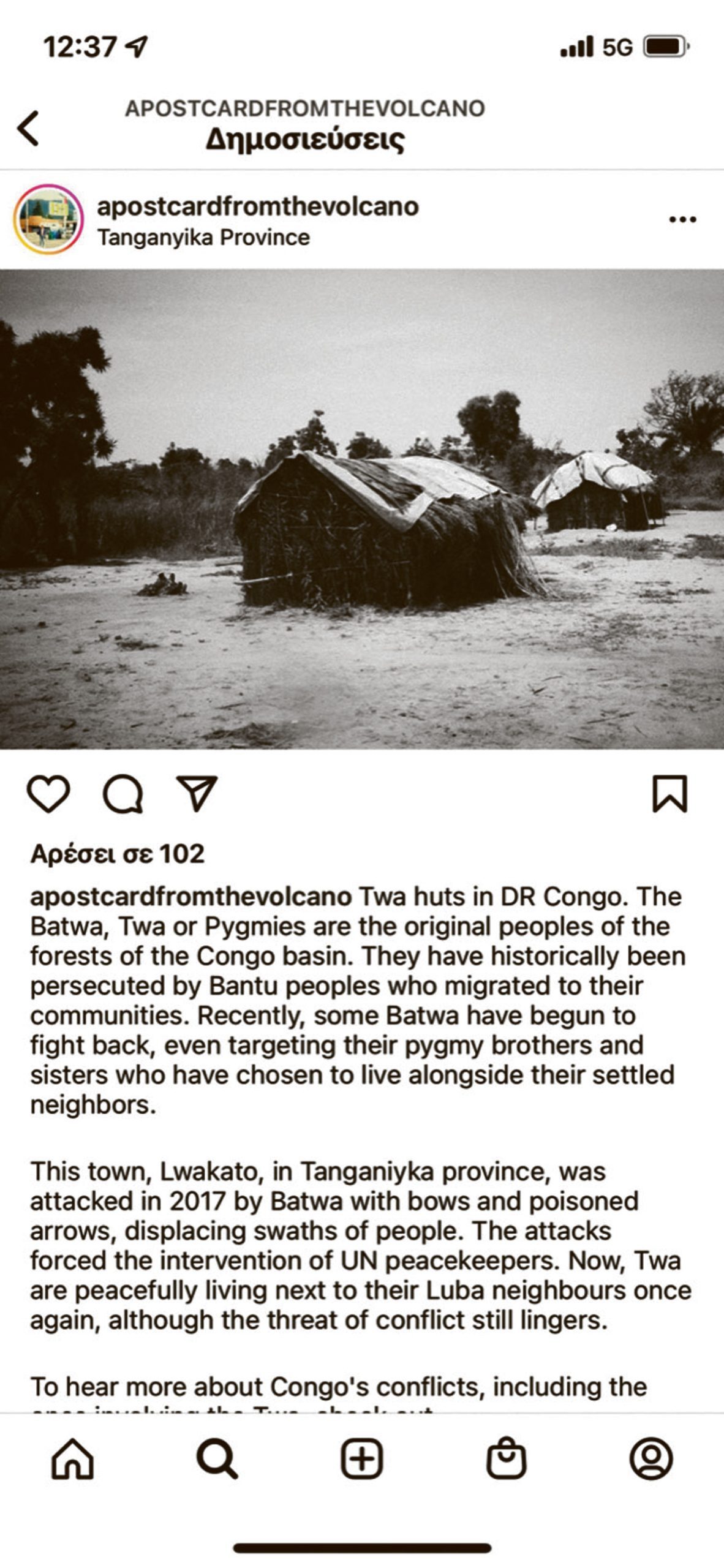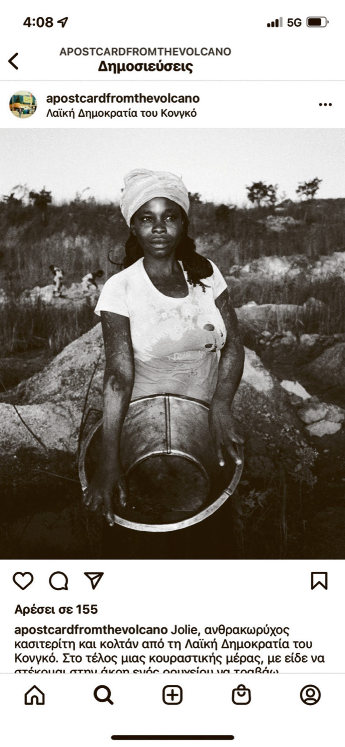 Στη μία δείχνει την καλύβα μελών της φυλής Twa και στην άλλη την Jolie, μια γυναίκα που εργάζεται στην εξόρυξη κολτάν, ένα από τα βασικά στοιχεία που χρησιμοποιούνται στις συσκευές μας. Μάλιστα, τη φωτογραφία αυτή ο Σταύρος-Νικόλαος Νιάρχος συνοδεύει με την κειμενολεζάντα: «Στο τέλος μιας κουραστικής μέρας με είδε να στέκομαι στην άκρη ενός ορυχείου να τραβάω φωτογραφίες και έσπευσε να μου δείξει κάτι μαύρες πέτρες που είχε βρει. Κολτάν. Ενα από τα βασικά στοιχεία στους ηλεκτρικούς πυκνωτές που χρησιμοποιούνται στις συσκευές μας. Η Jolie εκτίμησε ότι μπορεί να βγάλει 30 δολάρια από τις δώδεκα ώρες εργασίας της και είπε ότι ήταν μια πολύ καλή μέρα για εκείνη. Σχεδόν όλο το κολτάν του Κονγκό εξορύσσεται από άτυπους “καλλιτεχνικούς” εργάτες όπως η Jolie, η οποία αγωνίζεται να κρατήσει ζωντανά τα τρία παιδιά της σε μια χώρα που καταστράφηκε από τη φτώχεια».