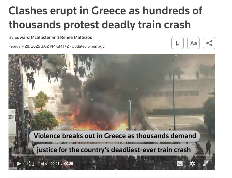 Σε νέο τηλεγράφημα το Reuters αναφέρει: «Συγκρούσεις ξέσπασαν στην Αθήνα καθώς εκατοντάδες χιλιάδες άνθρωποι διαδήλωσαν σε όλη την Ελλάδα για να απαιτήσουν δικαιοσύνη κατά τη δεύτερη επέτειο του πιο θανατηφόρου σιδηροδρομικού δυστυχήματος στη χώρα. Απεργοί σταμάτησαν τις αεροπορικές, θαλάσσιες και σιδηροδρομικές μεταφορές».