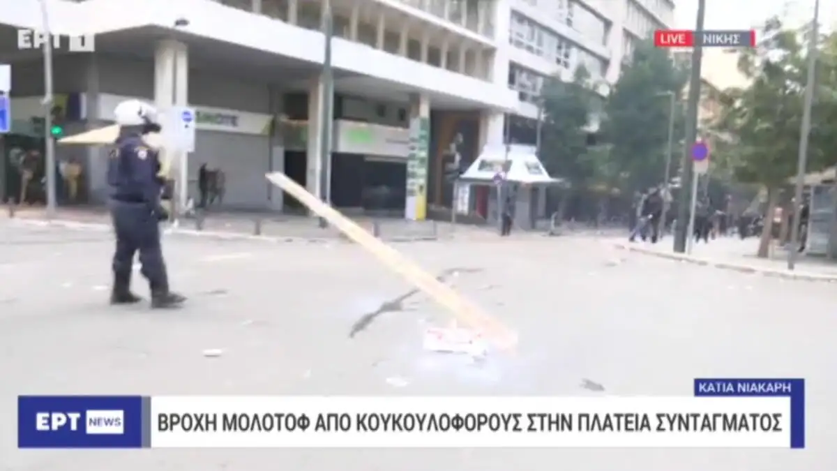 Η δημοσιογράφος στεκόταν στη γωνία Όθωνος και Φιλελλήνων, δίπλα σε αστυνομικούς, όταν από τη Μητροπόλεως άρχισαν ορισμένοι κουκουλοφόροι να πετούν αντικείμενα προς το μέρος της. Ένα καδρόνι, μάλιστα, πήγε κατευθείαν πάνω στη ρεπόρτερ και τον οπερατέρ. «Πρόσεξε Κάτια, προσέξτε κι εσείς, γιατί βλέπουμε καδρόνια… Δίπλα σου πέρασε… Καδρόνια, πέτρες, ότι μπορούν να βρουν…», είπε ο Γιώργος Σιαδήμας από το στούντιο.