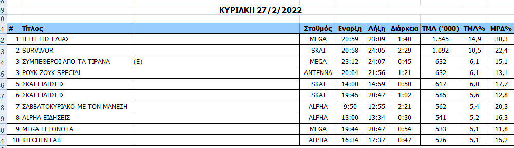 Την Κυριακή 27 Φεβρουαρίου, Η Γη της Ελιάς του MEGA “έφαγε” το Survivor και βρέθηκε στην πρώτη θέση με 30,3%. Το ριάλιτι επιβίωσης σημείωσε 22,4%, ενώ στην τρίτη θέση βρέθηκε η επανάληψη της σειράς Συμπέθεροι απ’ τα Τίρανα. Δελτία ειδήσεων, Rouk Zouk Special και Kitchen lab ολοκλήρωσαν τη δεκάδα.