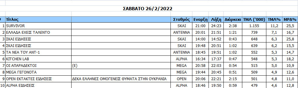 Το Σάββατο, λοιπόν, στην κορυφή του πίνακα βρέθηκε το Survivor με 25,5% ενώ ακολούθησε το Ελλάδα έχεις ταλέντο με 16,7%. Το ριάλιτι Φάρμα βρέθηκε εκτός δεκάδας, καθώς σημειώνει μονοψήφια ποσοστά, όπως και το Σπίτι με το Mega που όπως φαίνεται δεν κέρδισε την εμπιστοσύνη των τηλεθεατών.