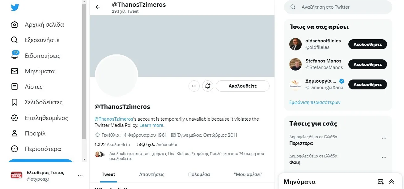 Όπως αναγράφεται στο προσωπικό του προφίλ, ο λογαριασμός δεν είναι διαθέσιμος καθώς έχει παρέβει τις αρχές πολιτικής της συγκεκριμένης πλατφόρμας.