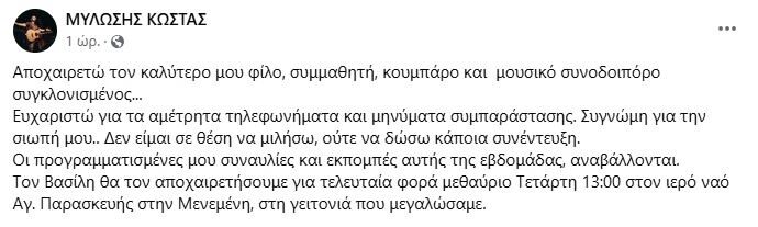 Οι προγραμματισμένες μου συναυλίες και εκπομπές αυτής της εβδομάδας, αναβάλλονται. Τον Βασίλη θα τον αποχαιρετήσουμε για τελευταία φορά μεθαύριο Τετάρτη 13:00 στον ιερό ναό Αγ. Παρασκευής στην Μενεμένη, στη γειτονιά που μεγαλώσαμε», έγραψε χαρακτηριστικά ο Κώστας Μυλώσης.
