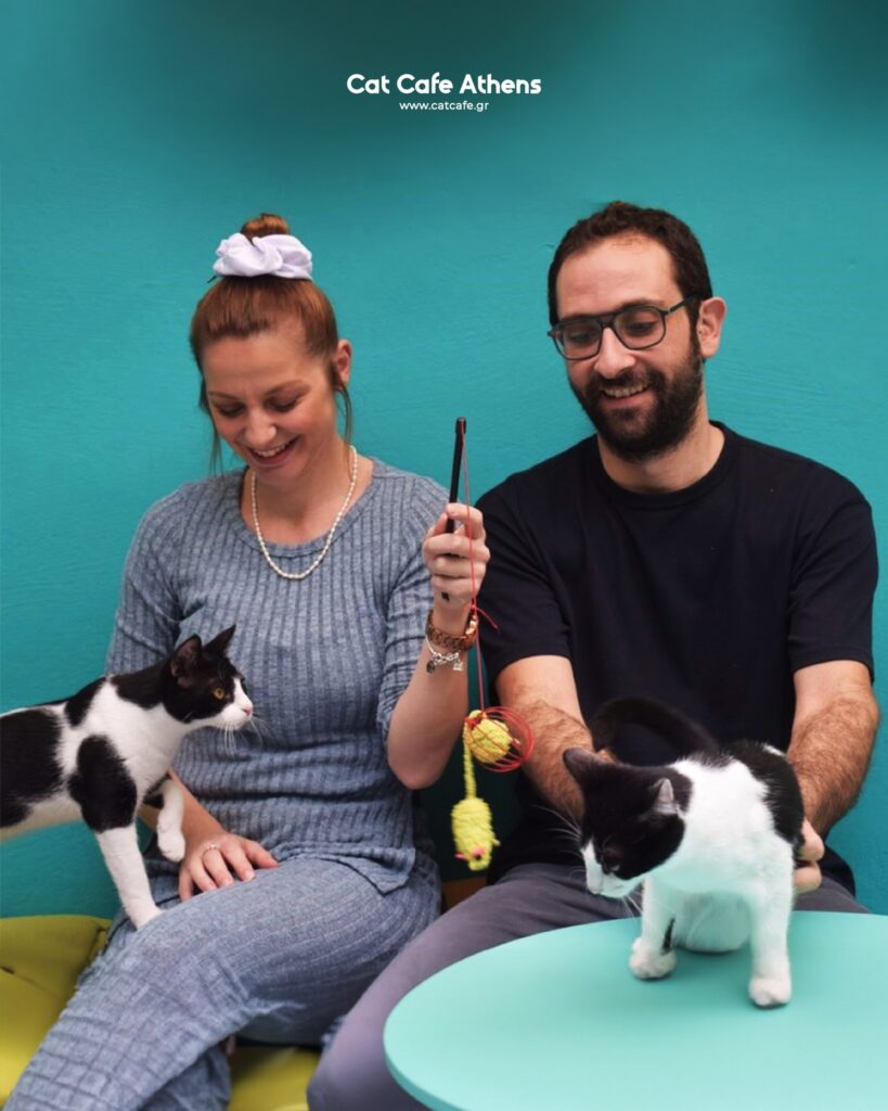 Οταν γνωριστήκαμε με τον Δημήτρη στην εταιρία που εργαζόμασταν και οι δύο, του φάνηκε αστείο στην αρχή! Μετά από σκέψη και έρευνα, τον έπεισα και επισκεφτήκαμε 4 Cat café στην Ευρώπη, είδαμε πώς δουλεύουν και έτσι πήραμε την απόφαση να παραιτηθούμε και να κάνουμε το βήμα να ανοίξουμε και στην Αθήνα.