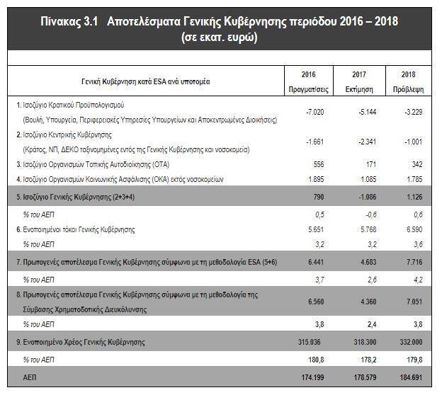 Σύμφωνα με την εκτίμηση του ΥΠΟΙΚ για το 2018, το πρωτογενές πλεόνασμα προβλέπεται να διαμορφωθεί στο 3,8% του ΑΕΠ, «ποσοστό που είναι συμβατό με τους στόχους του προγράμματος δημοσιονομικής προσαρμογής και παρέχει ένα σημαντικό περιθώριο ασφαλείας».
