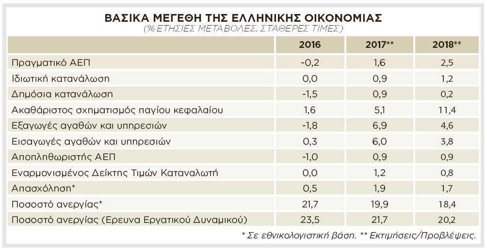 Ο προϋπολογισμός του 2018 κάνει την τρίτη κατά σειρά αναθεώρηση του ρυθμού ανάπτυξης, προβλέπει για φέτος οικονομική μεγέθυνση 1,6 % του ΑΕΠ (από 1,8% του ΑΕΠ στο προσχέδιο) και διατηρεί αμετάβλητη – προς το παρόν – την πρόβλεψη για ανάπτυξη 2,5% του ΑΕΠ για το 2018. Σύμφωνα με το ΥΠΟΙΚ, η ανάπτυξη για το 2018 θα βασιστεί στην αύξηση της ιδιωτικής κατανάλωσης κατά 1,2%, των επενδύσεων κατά 11,5%, και των εξαγωγών κατά 4,6% . Παράλληλα προβλέπεται αύξηση της απασχόλησης και μείωση της ανεργίας από το 21,7% στο 20,2%.