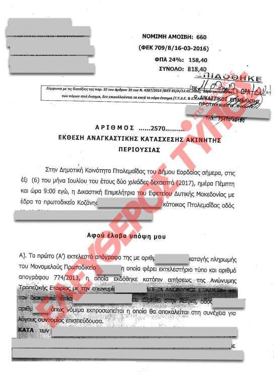 Από τους δύο πλειστηριασμούς, ο πιο άμεσα προγραμματισμένος (14.2.2018) αφορά σε ακίνητο, 82,62 τ.μ., στην περιοχή της Πτολεμαΐδας και θα διεξαχθεί για οφειλές προς την τράπεζα ύψους 124.570,55 ευρώ. Ετερος πολίτης στη Θεσσαλονίκη χάνει το σπίτι του (68,46 τ.μ.), στις 2.5.2018, οπότε και έχει οριστεί η ημερομηνία ρευστοποίησης, καθώς προ ετών έλαβε δάνειο σε ελβετικό φράγκο και λόγω της αλλαγής στην ισοτιμία (ευρώ-ελβετικό φράγκο) δεν μπόρεσε να ανταποκριθεί στις δόσεις του, με αποτέλεσμα να χρωστάει σήμερα στο συνεργαζόμενο πιστωτικό ίδρυμα 134.039,2754 ευρώ.