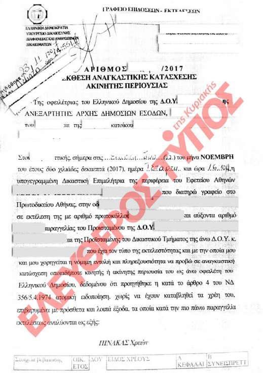 Πρόσθετα, η κατάσχεση αφορά σε σπίτι, 52 τ.μ., αξίας, 70.000 ευρώ, στην περιοχή του Αλίμου και πραγματοποιήθηκε (22/11) για χρέος ύψους 9.322,90 ευρώ στη ΔΟΥ της περιοχής λόγω αδυναμίας πληρωμής του ΕΝΦΙΑ. Το συγκεκριμένο ποσό προέκυψε από συσσωρεμένες δόσεις περασμένων ετών στις οποίες δεν μπόρεσε, λόγω οικονομικής δυσχέρειας, να ανταποκριθεί η κοπέλα που διέμενε στο σπίτι. Ακριβώς επειδή δεν είχε τη δυνατότητα να το συντηρήσει μετακόμισε στη μητέρα της, γι’ αυτόν το λόγο και το ακίνητο δεν είναι δηλωμένο ως πρώτη κατοικία.