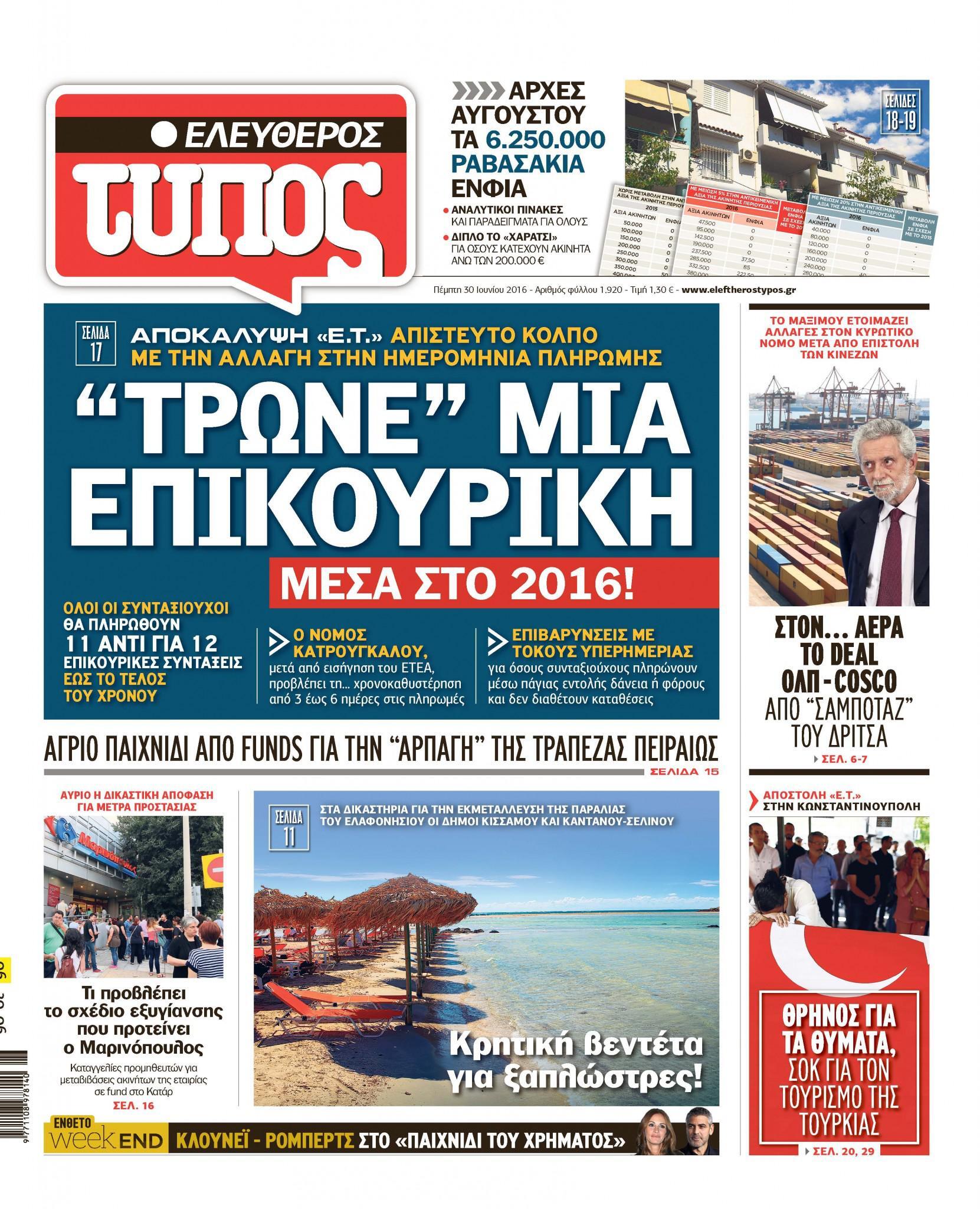 Εφαγαν μια επικουρική από τους συνταξιούχους με το κόλπο της αλλαγής στην ημερομηνία πληρωμής. Για το 2016 (και μόνο για αυτή τη χρονιά) οι συνταξιούχοι θα πληρωθούν 11 αντί 12 επικουρικές συντάξεις, επειδή η σύνταξη που θα έπαιρναν προκαταβολικά τον Ιούνιο θα καταβληθεί σε «δεδουλευμένη» βάση τη Δευτέρα 4 Ιουλίου.