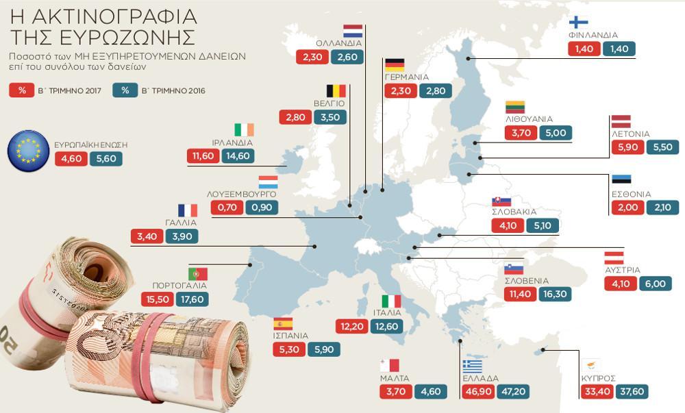 Σύμφωνα με τα στοιχεία της Κομισιόν, το δεύτερο τρίμηνο του 2017 τα ΜΕΔ στην Ελλάδα αντιπροσώπευαν το 46,9% του συνόλου των δανείων, όταν ο μέσος όρος στην Ε.Ε. ήταν μόλις 4,6%. Μάλιστα η μείωση των ΜΕΔ σε σχέση με δεύτερο τρίμηνο του 2016 ήταν ασήμαντη αφού δεν ξεπέρασε το 0,3% (από 47,2% σε 46,9%), ενώ στην Ε.Ε. μειώθηκε κατά μία ποσοστιαία μονάδα (από 5,6% σε 4,6%).