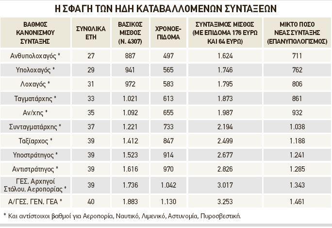 Παράδειγμα επανυπολογισμού: Αξιωματικός της Αστυνομίας βγήκε στη σύνταξη το 2009 με 40 έτη και με αποδοχές 2.319 ευρώ. Η σύνταξή του (μικτά πριν από τις μειώσεις) ήταν στα 1.848 ευρώ. Το 2012 με τις μειώσεις στα μισθολόγια των στρατιωτικών η σύνταξή του επανυπολογίστηκε στα 1.653 ευρώ (μικτά). Το 2014, με τη μερική αποκατάσταση του 50% των απωλειών, η σύνταξη επανυπολογίστηκε στα 1.751 ευρώ μικτά. Σήμερα παίρνει μικτά 1.220 ευρώ. Ο επανυπολογισμός με το νόμο Κατρούγκαλου γίνεται με τις αποδοχές του 2014, δηλαδή αυτές των 2.198 ευρώ, και όχι με τα 2.319 ευρώ που πραγματικά είχε ο απόστρατος κατά την ημερομηνία εξόδου στη σύντα¬ξη (2009). Με τον επανυπολογισμό η νέα μικτή σύνταξη βγαίνει στα 1.324 ευρώ, δηλαδή 25% κάτω από τα μικτά που έχει σήμερα. Στα καθαρά όμως η μείωση βγαίνει περίπου στο 17% γιατί τα 1.751 ευρώ έχουν τις περικοπές του Μνημονίου και υψηλότερο φόρο και εισφορά ασθένειας, ενώ η νέα σύνταξη των 1.324 ευρώ δεν έχει μειώσεις Μνημονίου, αλλά φόρο και εισφορά ασθένειας.