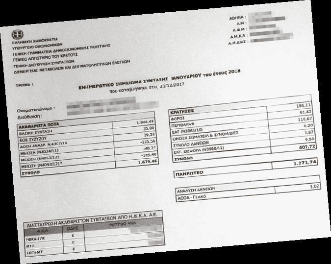 Το ενημερωτικό Φεβρουαρίου δείχνει ότι η σύνταξη του απόστρατου (Πολεμικής Αεροπορίας) από τα 1.271 ευρώ μειώνεται στα 1.240 λόγω διακοπής της αναδρομικής αύξησης των 39 ευρώ που ελάμβανε από τον Δεκέμβριο του 2014 ως και τη σύνταξη Ιανουαρίου 2018!