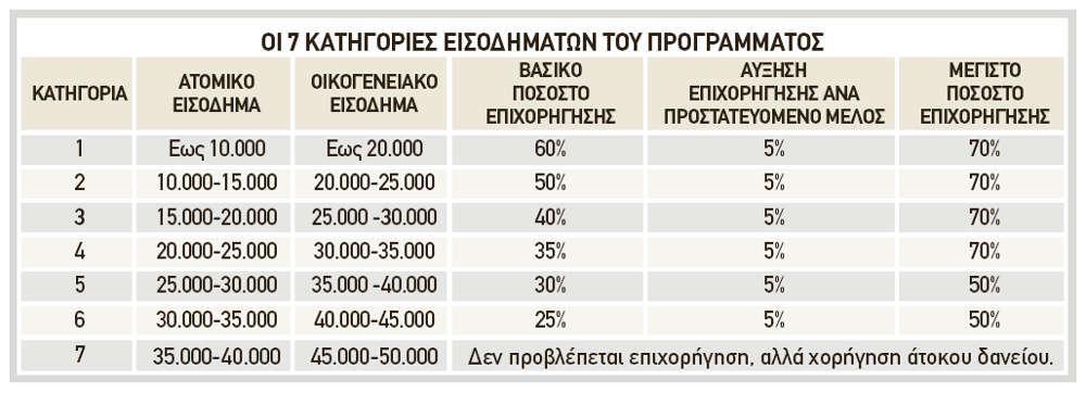 Προτεραιότητα δίνεται στην ένταξη οικογενειών με παιδιά (5% για κάθε ανήλικο μέλος – έως και 2 παιδιά) και νοικοκυριών με χαμηλά εισοδήματα. Για όσους έχουν ατομικό εισόδημα από 35.000 έως 40.000 ή οικογενειακό από 45.000 έως 50.000 αντίστοιχα (7η κατηγορία, πίνακας), παρότι δεν προβλέπεται επιχορήγηση, μπορούν να επωφεληθούν από το πρόγραμμα μέσω της λήψης άτοκου δανείου.