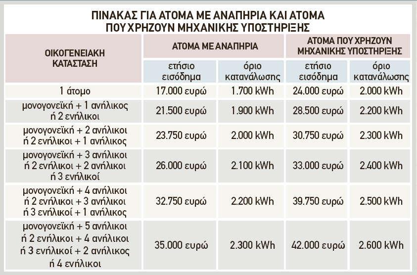 Για νοικοκυριό που στη σύνθεσή του περιλαμβάνει άτομο ή άτομα με αναπηρία 67% και άνω, τα εισοδηματικά όρια ένταξης στο ΚΟΤ αυξάνονται κατά 8.000 ευρώ ανά κατηγορία. Παράλληλα, για νοικοκυριό που στη σύνθεσή του περιλαμβάνει και άτομο ή άτομα που έχουν ανάγκη μηχανικής υποστήριξης με χρήση ιατρικών συσκευών, η οποία παρέχεται κατ’ οίκον και είναι απαραίτητη για τη ζωή τους, τα εισοδηματικά όρια αυξάνονται κατά 15.000 ευρώ.