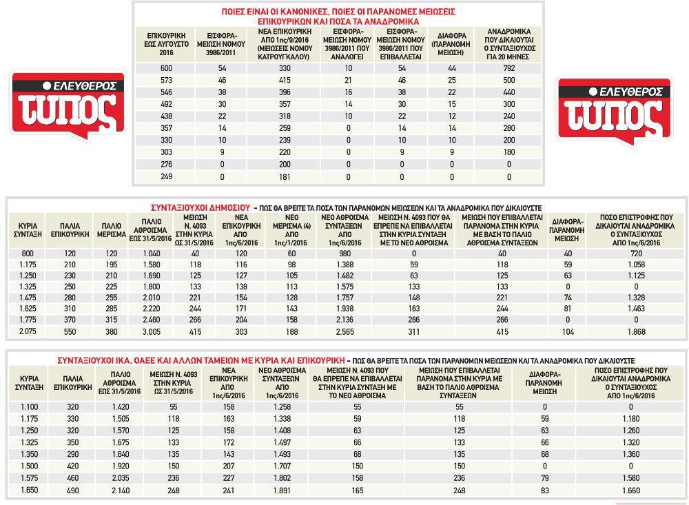 Για παράδειγμα, συνταξιούχος ΙΚΑ με αρχική επικουρική 586 ευρώ έπαιρνε καθαρά 239 ευρώ μετά τις παλιές μνημονιακές μειώσεις περιόδου 2011-2015. Με τον επανυπολογισμό του νόμου Κατρούγκαλου (Σεπτέμβριος 2016) η επικουρική μειώνεται στα 165 ευρώ μικτά και στα 138 ευρώ καθαρά!!! Τέτοιο ποσό αντιστοιχεί σε μισθό 1.100 ευρώ και σε 35 έτη, ενώ ο μισθός που είχε ο συνταξιούχος και δεν ελήφθη υπόψη στον επανυπολογισμό ήταν στις 2.300 ευρώ.