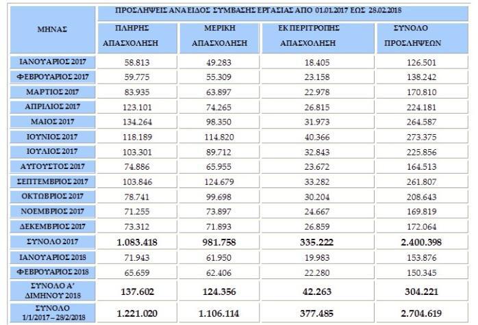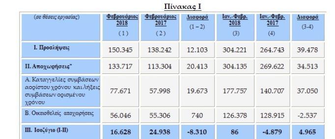 Από εκεί και πέρα το ισοζύγιο προσλήψεων- απολύσεων του διμήνου Ιανουάριος- Φεβρουάριος 2018 είναι θετικό κατά μόλις 86 θέσεις εργασίας.