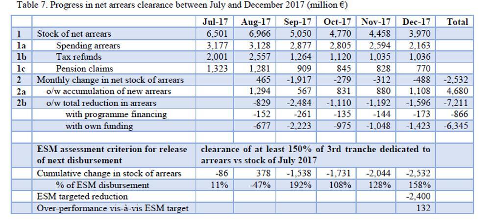 Οι απεσταλμένοι των δανειστών διαπιστώνουν στην έκθεσή τους πως το διάστημα Ιούλιος – Δεκέμβριος του 2017 τα συνολικά ληξιπρόθεσμα χρέη του Δημοσίου προς τους ιδιώτες μειώθηκαν κατά 7,2 δισ. ευρώ. Πρακτικά όμως η μείωσή τους είναι 2,53 δισ. ευρώ καθώς δημιουργήθηκαν νέα ληξιπρόθεσμα χρέη ύψους 4,68 δισ. ευρώ.