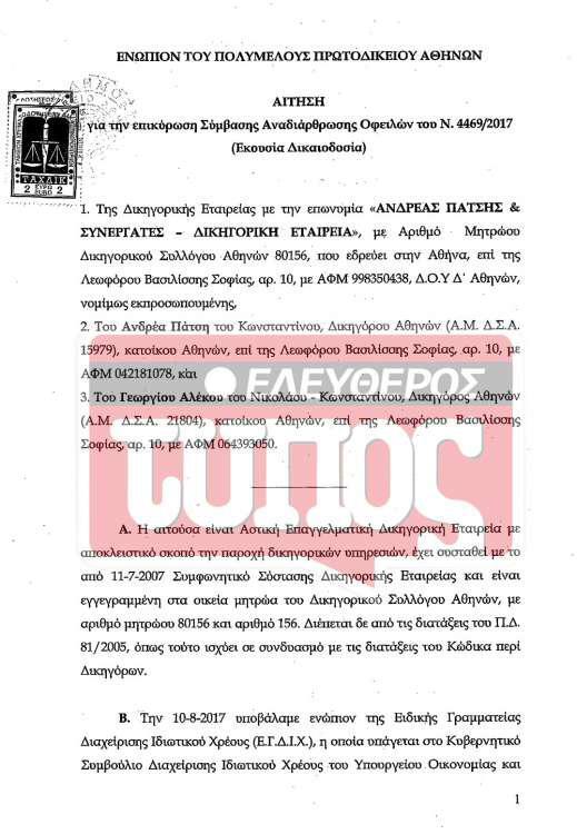 Από εκεί και πέρα, η δικηγορική εταιρία οφείλει 414.991,62 ευρώ προς δικαστικούς επιμελητές, ποσό που θα πρέπει να εξοφλήσει μέχρι τις 31.1.2019, όπως συμφωνήθηκε στο πλαίσιο του ν. 4469/2017. Πρόσθετη δέσμευση της οφειλέτριας εταιρίας αφορά σε αποπληρωμή χρέους συνολικού ύψους 46.653,98 ευρώ προς άλλους δικαστικούς επιμελητές. Η αποπληρωμή της συγκεκριμένης οφειλής θα λάβει χώρα σε 46 συνεχόμενες μηνιαίες δόσεις, ποσού: οι 45 πρώτες 1.000 ευρώ η καθεμία και η τελευταία, δηλαδή η 46η ποσού 653,98 ευρώ. Η καταβολή των δόσεων θα ξεκινήσει αφού εξοφληθεί ο παραπάνω πιστωτής (μετά τις 31.1.2019). Η πρώτη δόση πρέπει να καταβληθεί μέχρι τις 15 Φεβρουαρίου 2019 και οι υπόλοιπες 45 δόσεις μέχρι τις 15 κάθε επόμενου μήνα.
