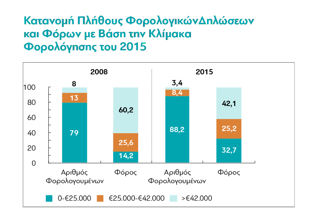 – Το 2015 το 88,2% των φορολογούμενων, που δήλωναν εισοδήματα κάτω των 25.000 ευρώ ετησίως, πλήρωναν το 32,7% των φόρων. Το υπόλοιπο 11,8% πλήρωνε το 67,3% των φόρων.