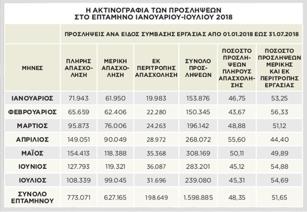 Η επίπτωση αυτή μάλιστα φαίνεται να παγιώνεται, καθώς στο επτάμηνο του 2018 οι προσλήψεις μερικής και εκ περιτροπής απασχόλησης υπερτερούν καθ’ όλη την περίοδο έναντι των προσλήψεων πλήρους απασχόλησης.