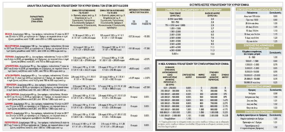 α) Το ανώτατο όριο του 1ου κλιμακίου, στο οποίο αντιστοιχεί συντελεστής κύριου ΕΝΦΙΑ 2 ευρώ ανά τ.μ. αυξήθηκε από 500 σε 550 ευρώ ανά τ.μ. και έτσι περιορίστηκε στα 551 έως 750 ευρώ ανά τ.μ. το εύρος των τιμών ζώνης που καλύπτει το 2ο κλιμάκιο, στο οποίο ισχύει συντελεστής κύριου ΕΝΦΙΑ 2,8 ευρώ ανά τ.μ. Ετσι σε περιοχές, στις οποίες οι αντικειμενικές τιμές ζώνης των ακινήτων ανέρχονταν σε 500 ευρώ ανά τ.μ. και μετά από μια αύξηση 10% έφθασαν στα 550 ευρώ ανά τ.μ. οι ιδιοκτήτες των ακινήτων αυτών παρέμειναν στο 1ο κλιμάκιο υπολογισμού του κύριου ΕΝΦΙΑ με αποτέλεσμα ο βασικός συντελεστής του φόρου αυτού να μην αυξηθεί από τα 2 στα 2,8 ευρώ ανά τ.μ. αλλά να διατηρηθεί στα 2 ευρώ ανά τ.μ. Επιπλέον σε περιοχές όπου η τιμή ζώνης παρέμεινε στα 550 ευρώ ανά τ.μ., ο κύριος ΕΝΦΙΑ του 2018 θα είναι μειωμένος για τους ιδιοκτήτες, καθώς τα ακίνητα που βρίσκονται στις περιοχές αυτές «έπεσαν» από το 2ο στο 1ο κλιμάκιο υπολογισμού του φόρου, οπότε ο συντελεστής με βάση τον οποίο προσδιορίζεται ο φόρος μειώθηκε αυτόματα από τα 2,8 στα 2 ευρώ ανά τ.μ.