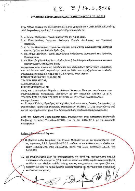 1 Σύμβαση ΟΤΟΕ-τραπεζών: Προβλέπει διετές πάγωμα μισθών για το 2017 και το 2018, με τις αμοιβές των τραπεζοϋπαλλήλων να μένουν στα επίπεδα που είχαν οριστεί και αναπροσαρμοστεί με τη σύμβαση του 2013! Η τότε κλαδική σύμβαση (2013) ήταν η τελευταία που προέβλεπε αυξήσεις αποδοχών στα μισθολογικά τους κλιμάκια, με λήξη το 2015. Οι επόμενες κλαδικές συμβάσεις (2016-2017-2018) διατήρησαν παγωμένους τους μισθούς στο ύψος που είχαν φτάσει το 2015, χωρίς καμία αύξηση. Η σύμβαση ΟΤΟΕ-τραπεζών είναι ντε φάκτο εφαρμοστέα σε όλους τους υπαλλήλους γιατί υπογράφηκε από τις τέσσερις μεγάλες συστημικές τράπεζες (Εθνική, Πειραιώς, Eurobank, Alhpa Bank) και από τις Συνεταιριστικές (Κρήτης, Ηπείρου, Θεσσαλίας) που απασχολούν πάνω από το 85% των εργαζομένων στον εγχώριο τραπεζικό κλάδο, ενώ το όριο για να είναι υποχρεωτική μια σύμβαση είναι να έχουν οι εργοδότες το 51% του συνόλου των απασχολουμένων στον κλάδο τους. Στην περίπτωση της σύμβασης των τραπεζοϋπαλλήλων όπου οι εργοδότες εκπροσωπούσαν το 85% και άνω των εργαζομένων, η όποια επέκτασή της ήταν περιττή. Παρά ταύτα, υπάρχει και άλλο ένα αγκάθι που μπορεί να καταστήσει τη σύμβαση κενή περιεχομένου για περίπου 5.000 τραπεζοϋπαλλήλους, για τους οποίους ετοιμάζονται προγράμματα εθελουσίας εξόδου που θα τρέξουν το 2019 και το 2020. Η ρήτρα προστασίας της απασχόλησης από αναδιαρθρώσεις τραπεζών εκπνέει στο τέλος του 2018, που λήγει και η κλαδική σύμβαση της ΟΤΟΕ, και μένει να φανεί αν θα παραμείνει στη νέα σύμβαση που θα υπογραφεί εντός του 2019.