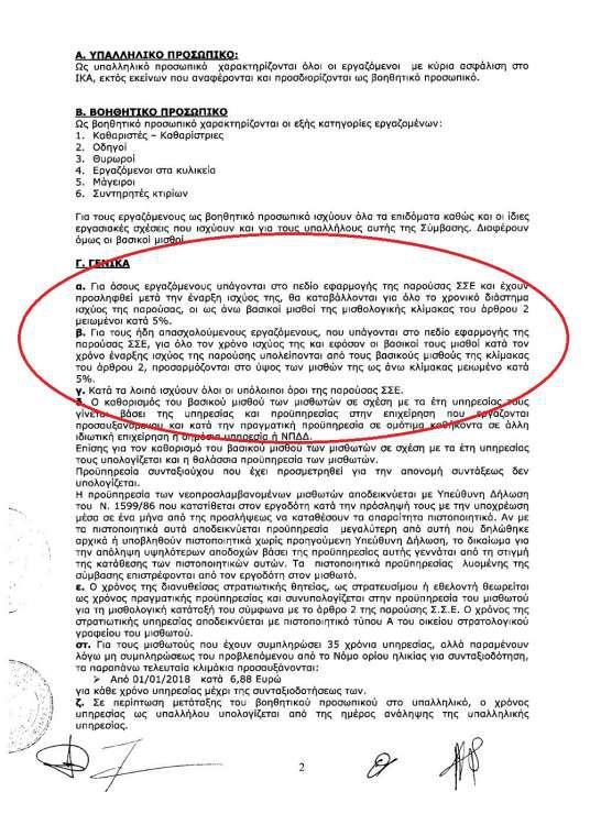 2 Σύμβαση ναυτιλιακών πρακτορείων και ναυτιλιακών επιχειρήσεων: Είναι μονοετής για το 2018 και προβλέπει μειώσεις μισθών κατά 5% για τους νεοπροσλαμβανόμενους αλλά και για τους παλαιότερους εργαζόμενους. Η σύμβαση που επέκτεινε το υπουργείο ως υποχρεωτική σε όλο τον κλάδο λέει ότι αν ο μισθός ενός υπαλλήλου είναι μικρότερος από το μισθό που προβλέπει το αντίστοιχο κλιμάκιο της σύμβασης, τότε παίρνει το μισθό του κλιμακίου με μείωση 5%. Για παράδειγμα, υπάλληλος ναυτιλιακής εταιρίας με 15 χρόνια έχει μικτό μισθό κλιμακίου 1.599 ευρώ. Με τη νέα σύμβαση έχει μείωση 5% και ο μικτός μισθός είναι στα 1.519 ευρώ. Οι νεοπροσλαμβανόμενοι έχουν εξαρχής τη μείωση του 5% στους βασικούς μισθούς του κλιμακίου όπου κατατάσσονται. Η μόνη αύξηση που δίδεται είναι 6,88 ευρώ το μήνα, για όσους έχουν 35ετία και περιμένουν να πιάσουν το όριο ηλικίας για να συνταξιοδοτηθούν.